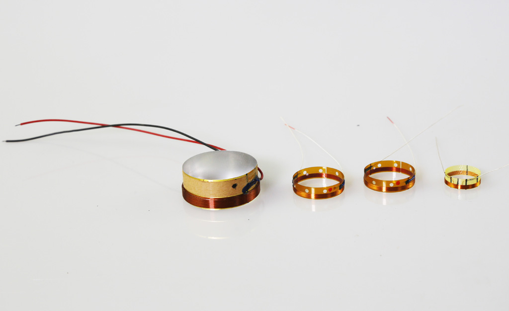 喇叭音圈根據低、中、高音單元的需要而有不同,高音喇叭音圈用十分細的線繞成,包括銅線和鋁線兩種,鋁線質重較輕,可獲得更佳的瞬態響應,但在承載力和耐用性方面不及銅線,中音和低音喇叭多用銅線繞音圈,而且銅線較粗能承受大功率